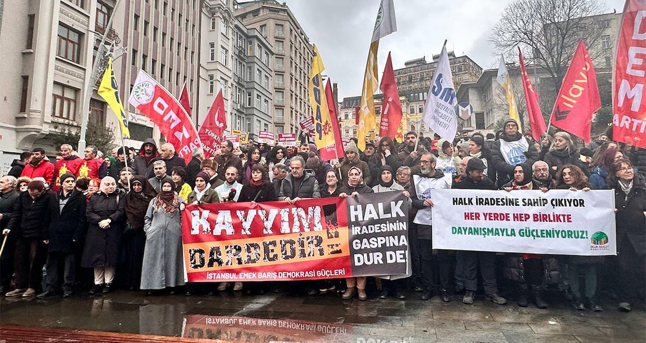 “Birleşe birleşe kazanacağız”, “Kayyumlar gidecek, biz kalacağız”, “Yasaklar sizin, mücadele bizimdir” sloganlarının atıldığı eylemde, Emek Partisi İstanbul Milletvekili İskender Bayhan ve Dem Parti İstanbul milletvekili Kezban Konukçu birer konuşma yaptı. Eylemde, Gaziantep Başpınar OSB’de düşük ücret ve kötü çalışma koşulları nedeniyle grev başlatan işçilere destek verilirken, BİRTEK-SEN Başkanı Mehmet Türkmen’in grevdeki işçilere verdiği destek nedeniyle tutuklanmasına tepki gösterildi.